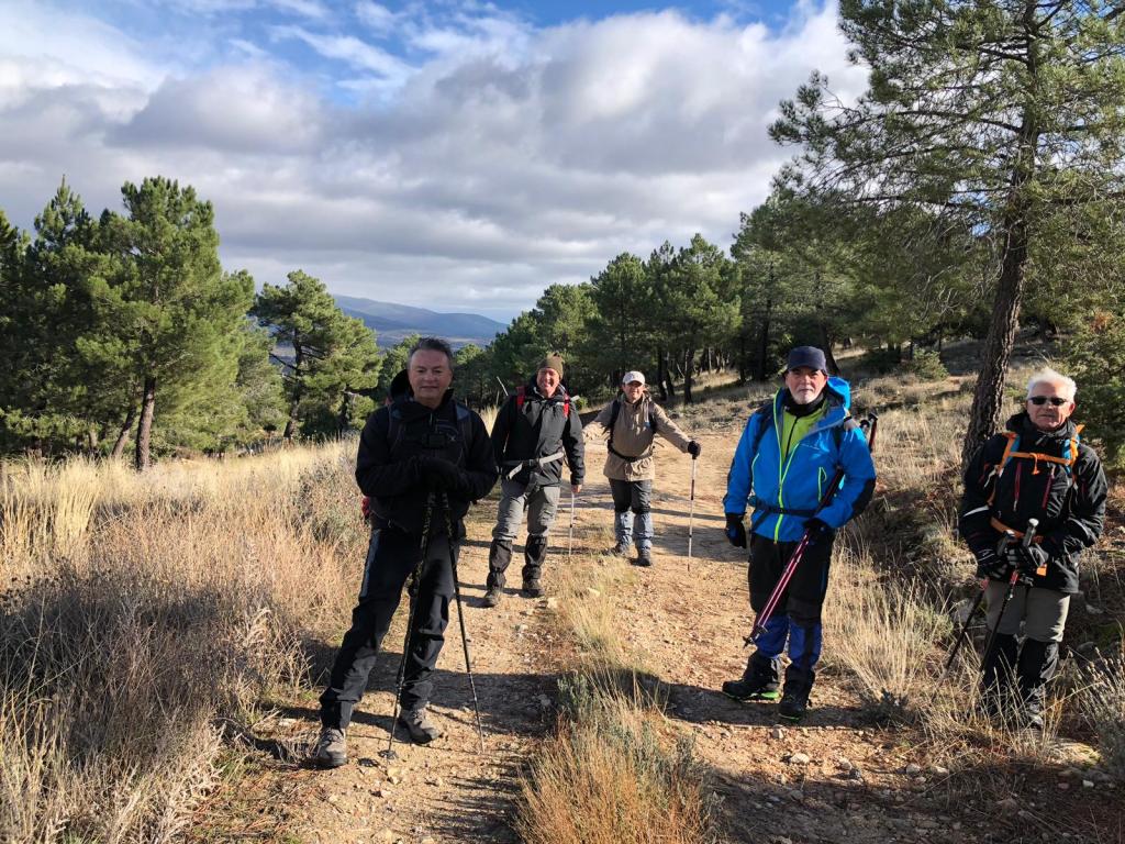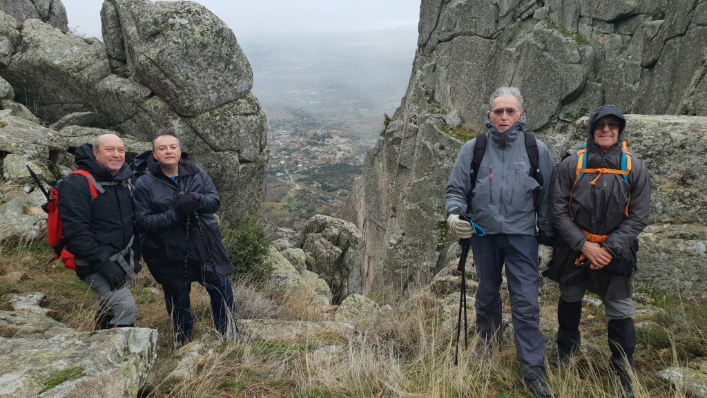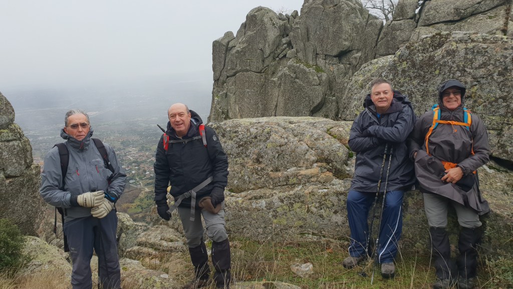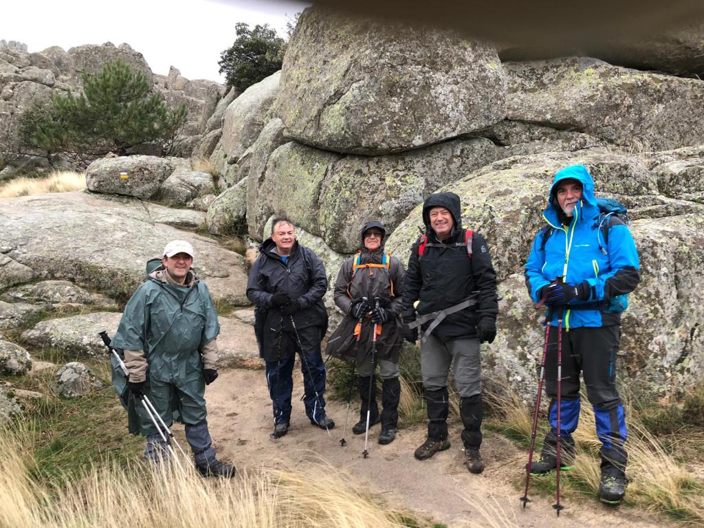 Ruta circular realizada el día 13 de diciembre de 2018 previa a la comida de Navidad basada en un buen cabrito asado. Partimos de Valdemanco con lluvia y casi con algún nuevo compañero de otro grupo que andaba un poco despistado.Al poco de empezar paró de llover y nos respetó toda la ruta salvo algunos copos de que nos cayeron a la altura del Cancho Gordo y que por ser los primeros del año casi que agradecimos. Rocas muy mojadas por lo que no subimos a los picos y realizamos el PR asomándomos de vez en cuando. Pasamos el Pico de la Miel y comenzamos el descenso. Hay que tener cuidado y no despistarse ya que para ir hacia el espalar hay que dejar por la izquierda el PR «que resulta muy tentador». No se ve bien (hierbas altas y sendero estrecho) por lo que hay que buscar el camino hasta llegar a la pista de tierra por la que volveremos por el Espaldar. El resto de la ruta transita por un bonito pinar hasta llegar a las vias del tren, ruta ferroviaria cerrada al tráfico. Resulta tentador coger el tunel que se ve desde la pista y que lleva directamente a Valdemanco, nuestro punto final, pero teníamos previsto subir por el Medio Celemín. Tampoco sabiamos como podía estar el tunel ni llevabamos lo adecuado, por lo que mejor «prudencia». LLegamos a Valdemanco finalmente, donde nos juntamos todo el grupo para dar cuenta de un estupendo cabrito asado