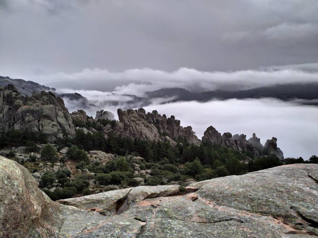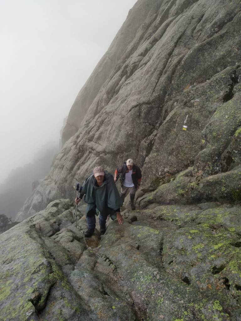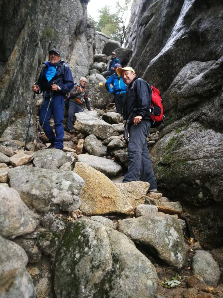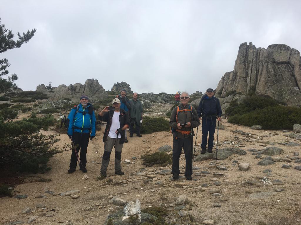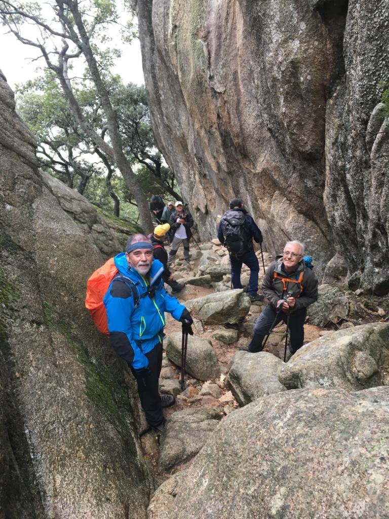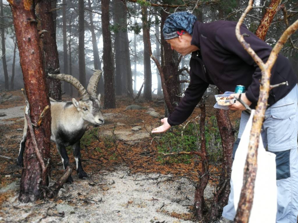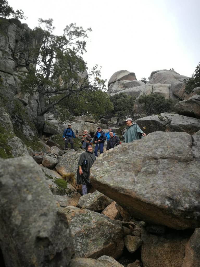 ¡Menuda ruta la realizada el pasado jueves!. Pedro se ha vuelto a superar con otra ruta de las cortas, 13,3 Km, pero intensas, 970 m de desnivel según GPS y mapas Topohispania. El día arrancó con algo de llovizna que desaparecía y volvia a cada rato, y con las lluvias del día y noche anterior, nos encontramos con todo muy mojado, lo que es muy relevante en La Pedriza, y algunos nos llevamos alguna culada pero sin daños, salvo en el orgullo. Arrancamos de Cantocochino siguiendo el PRM-1 Integral marcado como es norma con blanco y amarillo. Toda la ruta está perfectamente señalizada por lo que no hay pérdida a poco que nos vallamos fijando. Llegamos sin complicaciones al Collado del Cabrón y continuamos hacia el Canal del Pajarito que superamos ya poniendo mucho cuidado pues la piedra está muy húmeda. Así llegamos a la Campaña y a su jardín. Tenemos que continuar hacia el collado de la Romera para lo que volvemos a trepar sin grandes complicaciones pero llegamos al canal de los Tres Cestos y al famoso diedro. Antes hay un paso en el que los menos ágiles necesitamos una manita de ayuda puesto que no hay agarre fácil. El el diedro ocurre lo mismo ya que ha desaparecido la cadena de la parte de arriba que servía como agarre lo que complica mucho el subir. Menos mal que en el grupo hay «gatos» que suben por cualquier lado y que siempre están dispuestos. A partir de aquí no hay ya complicaciones reseñables salvo unas placas de piedra en la bajada entre el Collado del Miradero y Cuatro Caminos (marcadas en el track). Con retraso paramos para el ágape de las 12h para reponer fuerzas y se nos acercó con todo el descaro del mundo un macho cabrío impresionante, literalmente demandando comida. Alcanzamo el collado del Miradero en poco tiempo e iniciamos el descenso hacia Cantocochino, no sin bastantes paradas motivadas por el afan recolector y la disponibilidad de materia prima que hicieron que esta ruta también tubiese un aliciente micológico. En resumen una gran ruta que disfrutamos muchísimo, con retos y un nivel de complicación alto motivado por el estado de las piedras, pero hay que tener mucho cuidado en algunos tramos ya que en caso de caida esta puede ser bastante notoria. ¡¡¡Se me olvidaba, enhorabuena a Juan Carlos, el nuevo cazaboletus del grupo, que ya ha conseguido verlos!!. Ahora solo falto yo……..