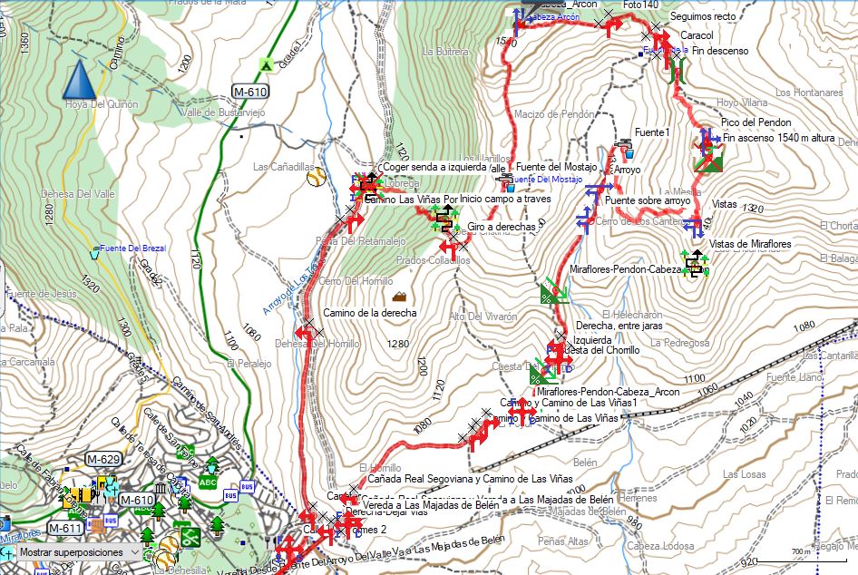 Ruta ideal para el invierno cuando la climatología complica mucho las cosas a cierta altura. La cota máxima es de algo mas de 1500 m lo que lo hace viable. Arrancamos desde la estación de Renfe de Miraflores y seguimos las vias hasta llegar a la cañada real donde nos desviamos por el camino de las Viñas que discurre paralelo a estas pero ya ascendiendo. A poco mas de 2,5 Km del inicio llegamos a la cuesta del Chorillo que nos lleva hasta El Badén. Desde aquí se aborda el ascenso hasta el Pico del Pendón. Desde el Badén se nos complicaron bastante las cosas ya que el camino desaparece por completo debido a que las jaras, de mas de 2 m en su mayoría hacen que toda la zona resulte bastante intransitable. No obstante buscando los pasos y con bastantes arañazos alcanzamos el mirador de la zona de La Mesilla. Desde ahí el ascenso ya es claro y con un sendero visible. Llegamos al final al Pico del Pendón. Tras las fotos correspondientes bajamos al collado del Tiro de Barra para ascender de nuevo al Cerro de Cabeza Arcón y desde allí retornar a la estación de Miraflores por Cabeza Cristina y por el tramo del valle del camino de las Viñas