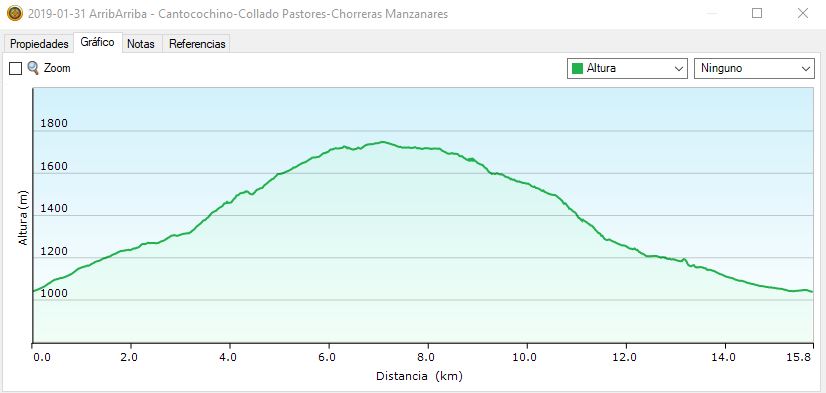 Desde Canto Cochino se sube a la cuerda de Los Porrones, a la que se llega tras un intenso repechón de 1,8 Km en su último tramo. Desde la cuerda continúa el ascenso, ya mas cómodo hasta el collado del Porrón donde se deja la cuerda para enfilar el camino al collado de los Pastores, punto mas alto del recorrido (1735 m). Desciende hasta el Puente de los Manchegos donde se abandona de nuevo la pista por la derecha para tomar el PRM18 que baja junto al rio hasta Canto Cochino. Hay que tener buen ojo para encontrar el inicio cuando hay nieve pero está marcado en la pista por dos hitos en el lado derecho. Luego el sendero, habiendo nieve y desde la parte alta hasta el mirador de las chorreras, tiene tramos en los que resulta complicado seguir por lo que precaución y ojo al GPS para no enrocarse o coger zonas de rocas con bastante riesgo. Fotos de rigor en el mirador de la chorrera y ya hasta cruzar el rio por el puente de madera. Desde este punto ya es «zapatada» hasta el coche.