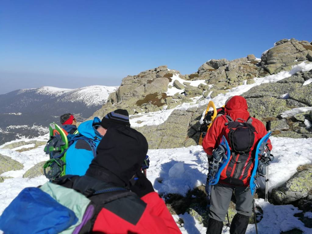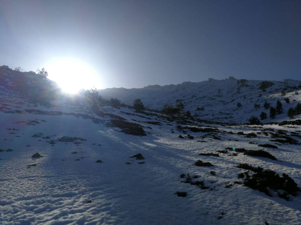La ruta la realizamos el pasado día 21 de febrero de 2019 arrancando del puerto de Cotos y con un día excelente, sol radiante y poco viento. Al poco de salir, y no mas allá del refugio del Pingarrón, tubimos que ponernos los crampones debido a las placas de hielo y la nieve dura. Ya no nos los quitamos hasta haber bajado bastante por la loma del Noruego y cerca de Cotos. Nuestro primer destino es subir al collado de las Cabezas a 2331 m de altitud. En el tramo final del ascenso, de 1,6 Km y 504 metros de ascenso, se hace especialmente duro (31% de pendiente) pero poco a poco alcanzamos nuestro primer objetivo.