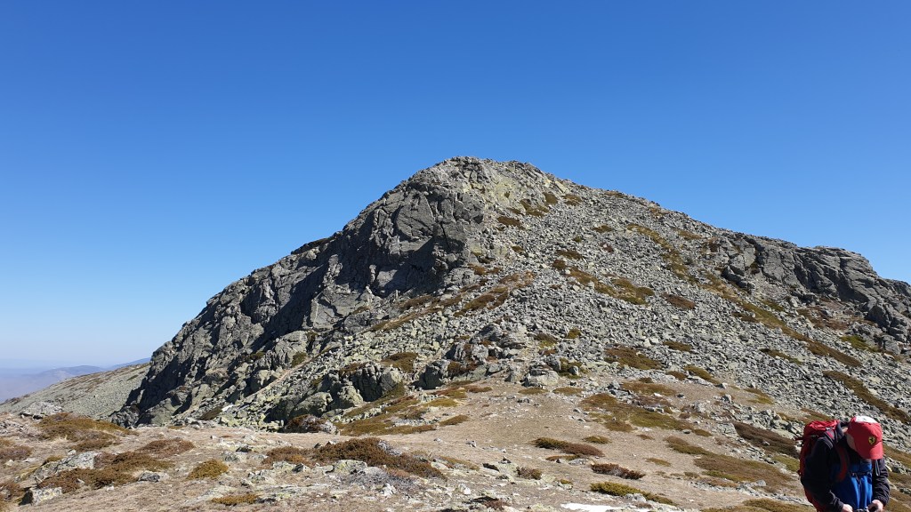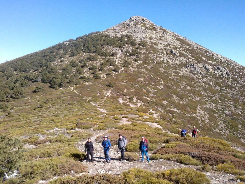 Arrancamos desde las Dehesas y encaramos la subida al puerto de la Fuenfría por la calzada romana, también llamada borbónica, que rápidamente nos pone en el puerto una vez salvado el tramo final que es el mas exigente. Desde el puerto nos dirigimos a Cerro Minguete, ineludible para llegar al Montón de Trigo. Se puede considerar la opción de no subir al Montón cogiendo un sendero por la ladera sur que nos lleva hasta el collado de Tirobarra, pero ya que estamos no tiene sentido no hacer todas las cumbres de la cuerda de La Mujer Muerta. Tras descender del Montón continuamos hacia La Pinareja cuya subida solo se complica ligeramente en el último tramo que es un canchal. El mismo que nos encontraremos desde su cima hasta la del Pico del Oso. Desde la cima disfrutamos por un lado de las vistas hacia Valsaín, La Camorca y Peñalara; por otro Siete Picos, Bola y La Maliciosa; el valle del rio Moros y Cueva Valiente; y por último la meseta castellana. Comentar que en algunos mapas aparece un sendero por la ladera sur que permitiría salvar la subida a La Pinareja para llegar a la Peña del Oso pero no encontramos ni rastro del inicio del mismo.