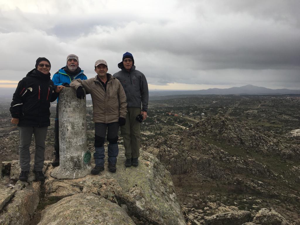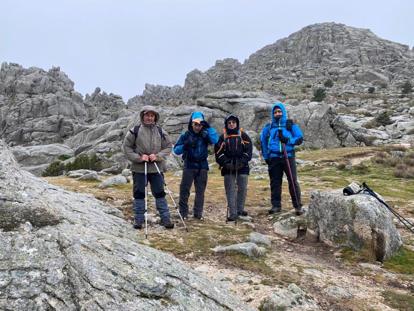 Partimos desde el Hostal del Cancho del Águila con dirección al collado de Las Cabreras desde donde parte el camino de ascenso al pico de Las Cabreras. Es una subida sin complicaciones destacables, aunque los torpones como yo tenemos que echar una manita al suelo para subir y en alguna piedra el culombio para bajar pero los gacelas del grupo simplemente con algún saltito lo arreglan. En cualquier caso es una subida divertida y fácil. Tras la foto de rigor descendemos y nos encaminamos a la Piedra Mojada, un pequeño cerro sin mucho que ver. Volvemos al collado de Las Cabreras y bordeamos el cerro del Pesebre por su parte norte hasta alcanzar el camino de la cantera y desde este cruzar el arroyo y coger la pista que nos lleva al otro lado de la A1. Pasado el puente de la A1 tomamos dirección sur hacia La Cabrera con intención de subir al Pico de la Miel por el PR13, que es el camino mas sencillo para subir a la cuerda de La Cabrera cuyo primer alto es el Pico de La Miel. Como ya el tiempo ha empeorado, está lloviendo y tenemos bastante aire, no subimos al pico (ya estuvimos hace dos semanas) y encaramos el PR13 hasta llegar al Cancho Gordo, desde cuyo collado descendemos hacia La Cabrera. Esta bajada es muy cómoda de hacer y bastante menos arriesgada en mojado que la que baja directamente desde el Pico de La Miel.