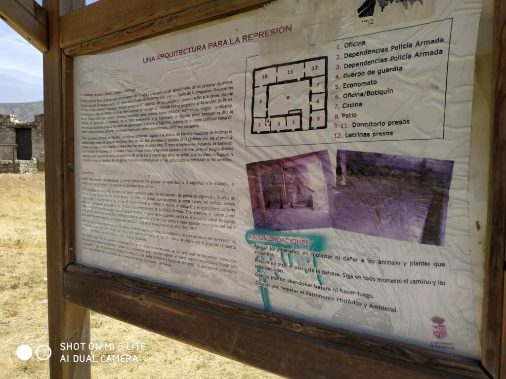 Después del Angelus dejamos la vía para dirigirnos a la zona de la Dehesa Vieja y llegar a los Barracones, antigua carcel de trabajos forzados de la posguerra. Pensando ya más en el cabrito que en otra cosa terminamos nuestra ruta en Bustarviejo donde tenemos los coches.