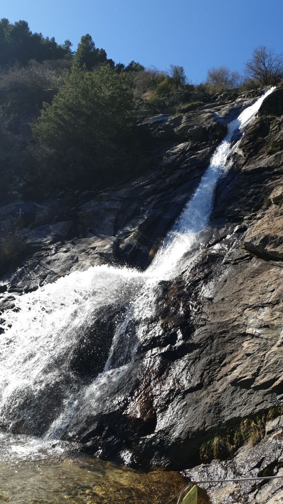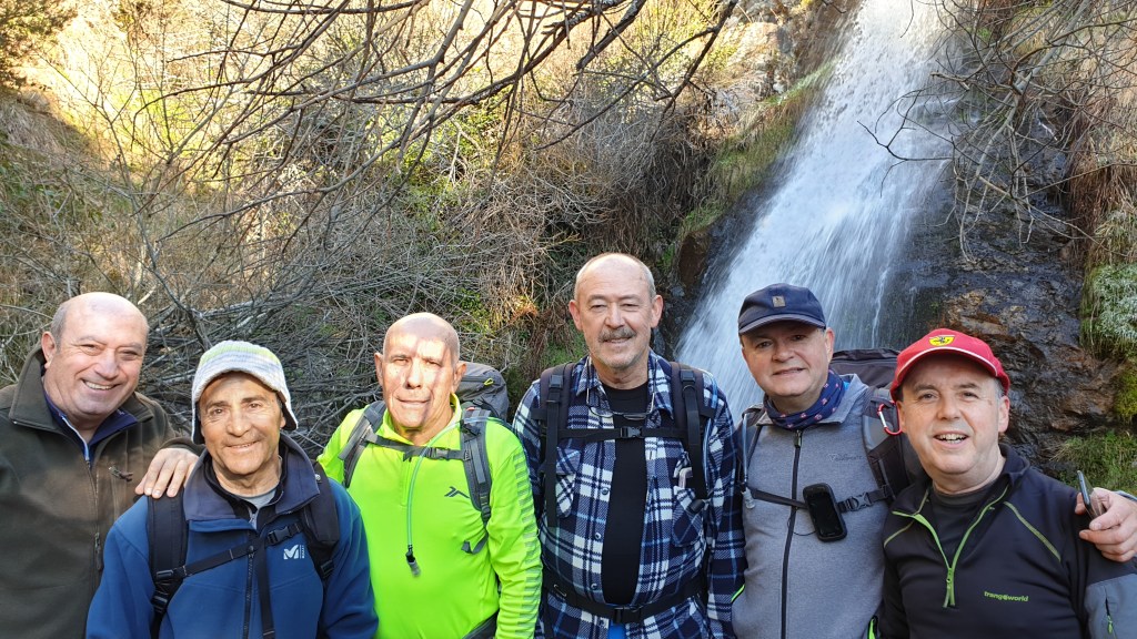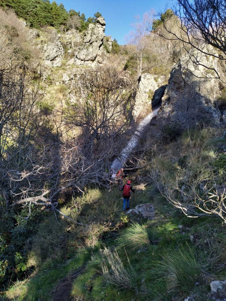 Hechas las fotos de rigor, decidimos no seguir el track original que cruzaba el arroyo por encima de la chorrera y subía hasta la pista directamente por su margen izquierda. En su defecto ascendimos a la misma pista, pero en el margen derecho del arroyo ya que a pesar de tener que añadir varios cientos de metros a la ruta nos iba a resultar más rápido que la idea original.