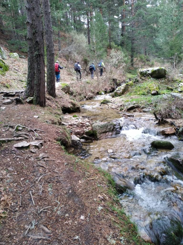 La ruta comienza en el embalse de Navalmedio, al que se llega desde la carretera de subida al Puerto de Navacerrada. Arrancamos por el Camino del Calvario hacia el Puerto de Navacerrada. La subida discurre junto al arroyo de Matasalgado hasta llegar al arroyo de la Fragüilla donde lo dejaremos por la izquierda para coger el sendero Whistler que sigue junto al arroyo. Unos 250 metros más arriba el sendero gira a la derecha y sube junto al arroyo del Puerto que nos conduce hasta Navacerrada. Unos 800 m antes de llegar al puerto dejamos el sendero Whistler por la derecha por un sendero que continúa hasta el puerto y comienza cruzando de nuevo el arroyo y con un corta pero fuerte subida. Partimos con una temperatura estupenda para caminar pero al llegar a este punto comenzó la lluvia y el viento del oeste. Ya camino hacia el risco de los Emburriaderos el viento arreció por lo que decidimos continuar por la senda de la Tubería en lugar de crestear por la cuerda de las Cabrillas. La lluvia y la nieve a ratos no nos dejaría hasta bastante avanzada la senda Bambi.