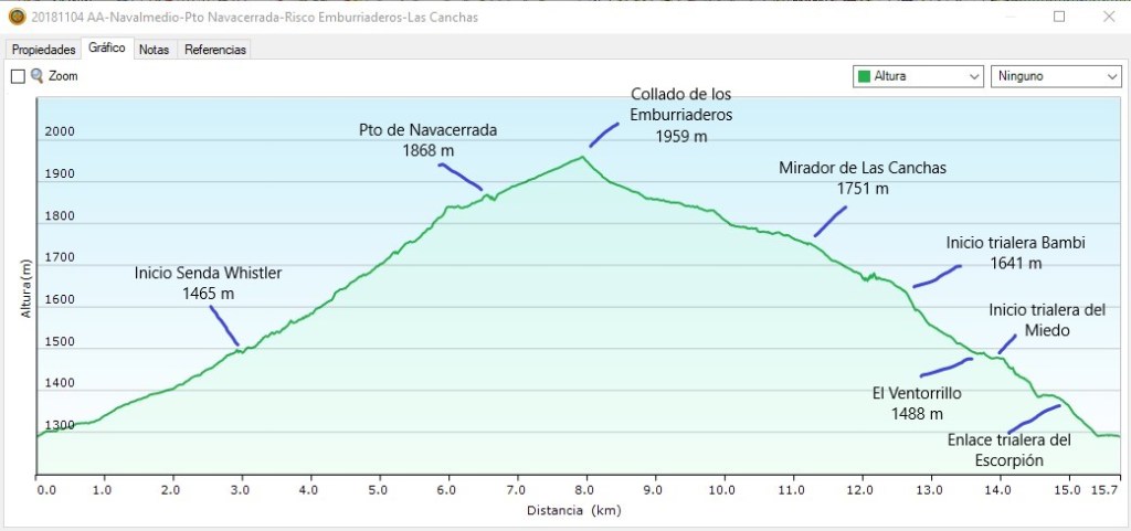 Aparcamiento embalse de Navalmedio (Navacerrada) – Camino del Calvario – Senda Whistler – Puerto de Navacerrada – Collado de Emburriaderos – Senda de la Tubería – Mirador de las Canchas – Trialera Bambi – El Ventorrillo – Trialera del Miedo – Trialera del Escorpión