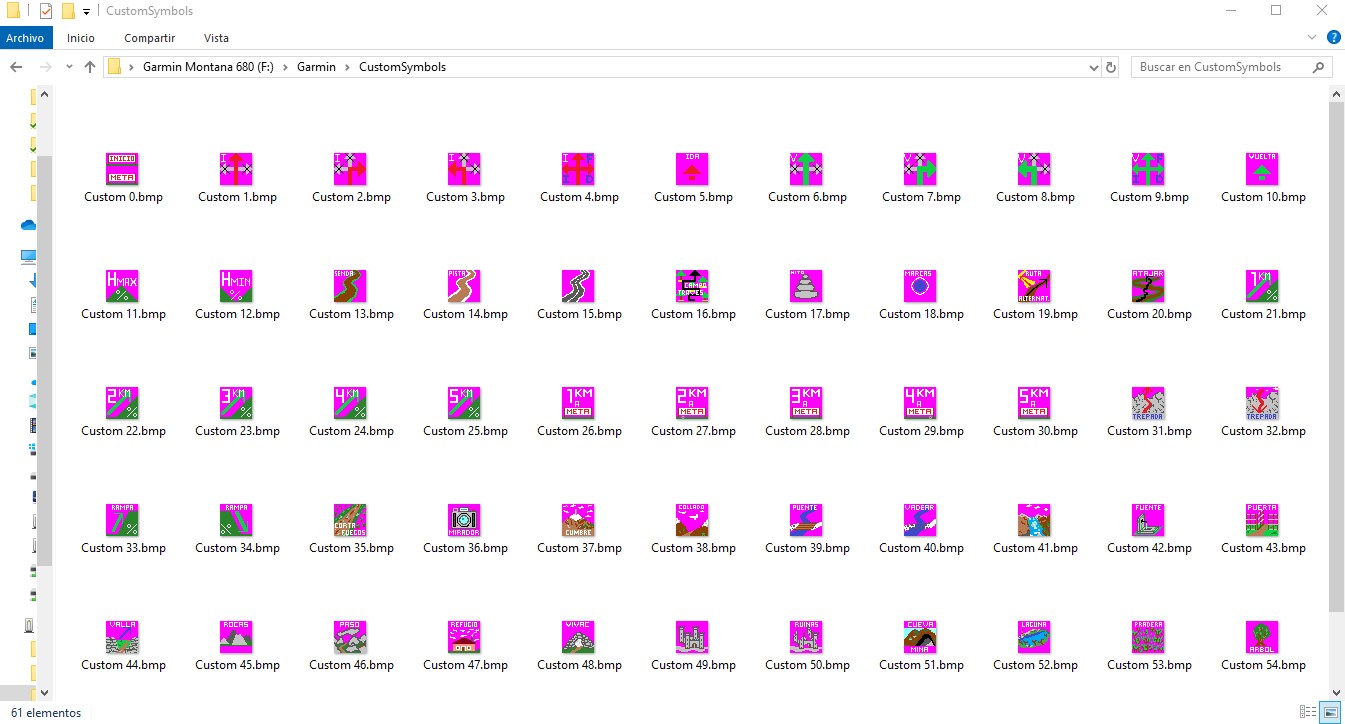 Los ficheros en el GPS se tienen que almacenar en la carpeta «Garmin» de la memoria interna del GPS (Garmin Montana 680) y dentro de esta en al carpeta «CustomSymbols»