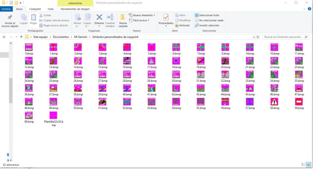 En el PC los datos de los iconos personalizados se almacenan en la carpeta «Simbolos personalizados de waypoint» que se encuentra en Este equipo / Mis documentos / Mi Garmin. Todos los ficheros en esta carpeta tienen el formato de número.bmp