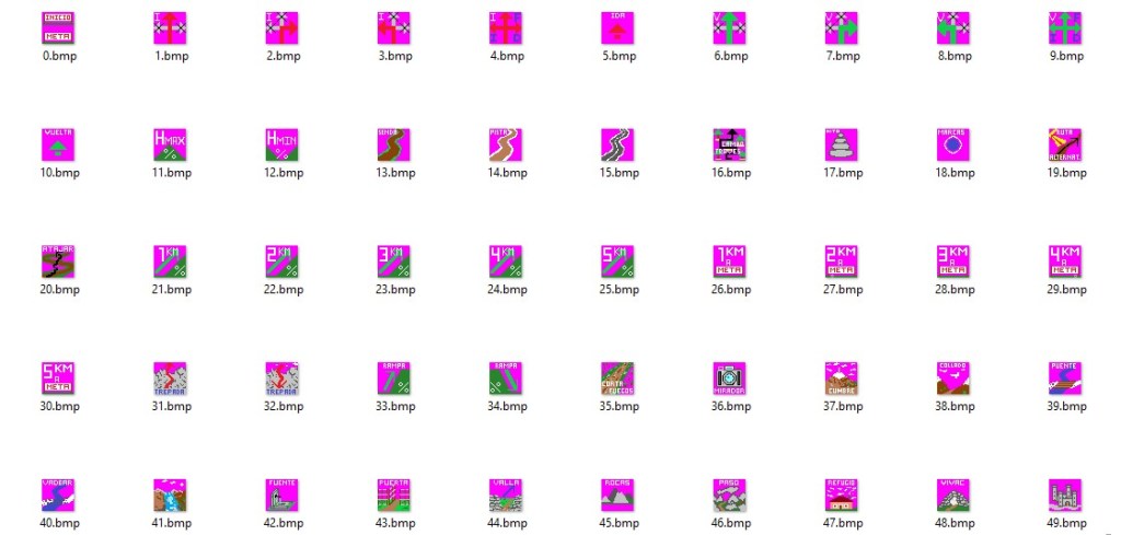Hay que diferenciar los que se almacenan en el PC para que sean utilizados desde BaseCamp y los que hay que almacenar en la memoria del GPS. Así cada icono tendrá dos ficheros, uno que se carga en la memoria del PC y otro que se carga en la memoria del GPS. Los ficheros a almacenar en el PC tienen que nombrarse con un número del 0 al 63 y con extensión .bmp (p.ej: 0.bmp, 17.bmp, 58.bmp,…). Los ficheros a almacenar en el GPS deben nombrarse como «Custom» + número del 0 al 63 y con extensión .bmp (p.ej: Custom 0.bmp, custom 17.bmp, custom 58.bmp). De esta manera, por ejemplo, el mismo icono tendrá un fichero que se llamará 17.bmp (en el PC) y otro que se denominará custom 17.bmp (en el GPS).