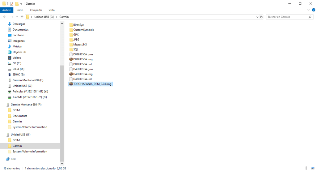 y nos encontraremos en la carpeta “Garmin” de la “Memoria Externa del GPS un nuevo fichero de 2Gb llamado “TOPOHISPANIA_DEM_2.04.img”.
