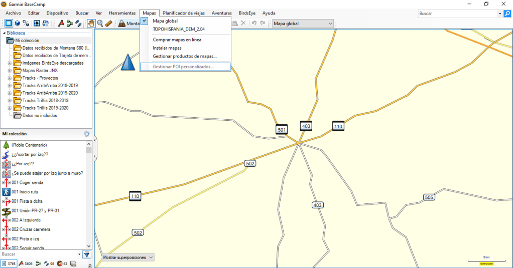 Abrimos BaseCamp y seleccionando “Mapas” ya nos tiene que salir el TopoHispania 2.04 en el desplegable y seleccionándolo podemos visualizarlo.