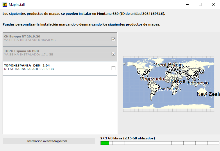 Al seleccionar la instalación del mapa en la tarjeta de memoria se abre una nueva ventana llamada MapInstall. En ella se nos presentan los mapas que podemos instalar en el GPS.